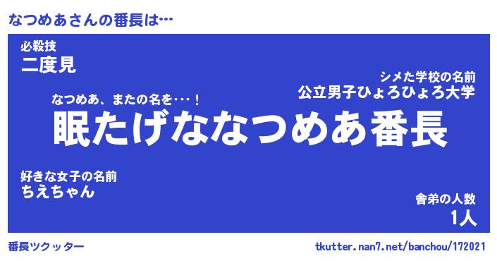 | 意味不明あだ名 | 『ペロリンなつめあ』『永久保存なつめあ』 |