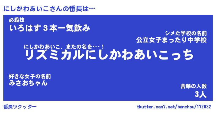 | ポケモン風あだ名 | 『ニシチュウ』『ニシカダネ』 |