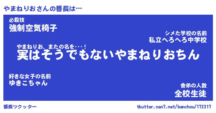 | 肩書あだ名 | 『やまねりお御曹司』『やまねりお班長』 |