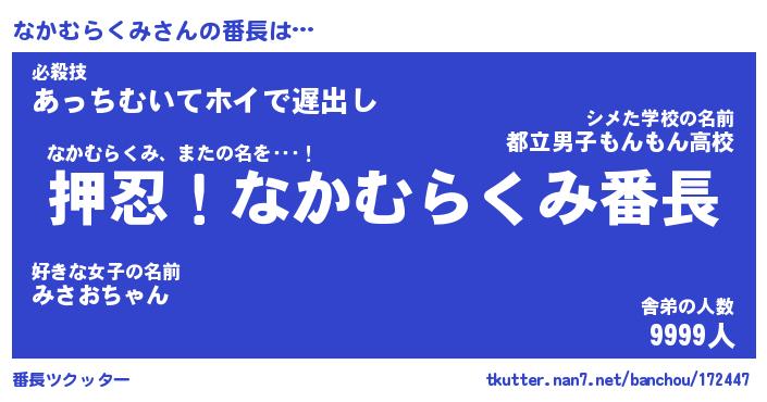 | ヒーロー風カッコイイあだ名 | 『スーパーナカムラクミ』『天弓騎士ナカ』 |