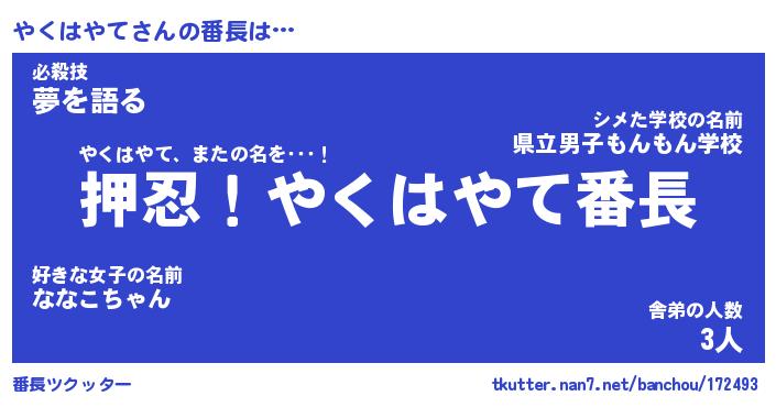 | 肩書あだ名 | 『やくはやて社長』『やくはやて総理大臣』 |