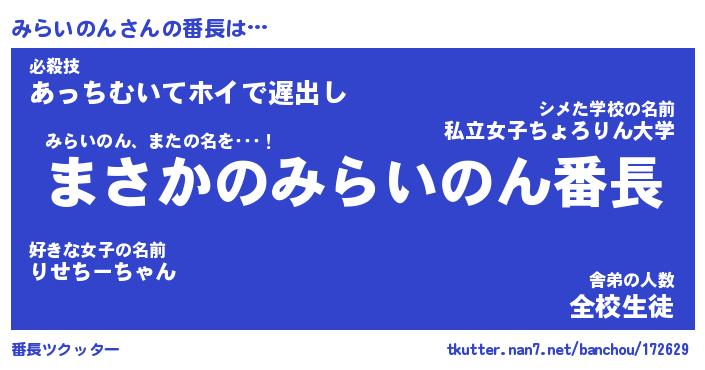 | ヘコむあだ名 | 『みらふぇ~』『なまこ酢』『みらお』 |
