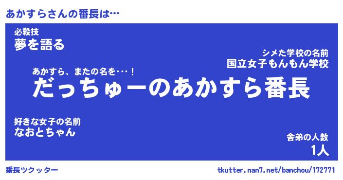 | 意味不明あだ名 | 『ペロリンあかすら』『永久保存あかすら』 |