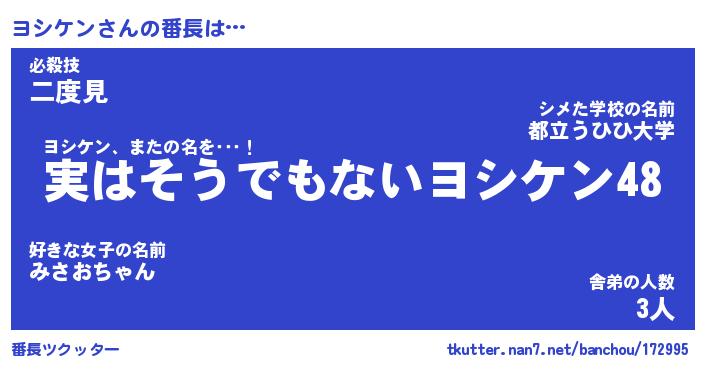 | ヘコむあだ名 | 『ヨシにー』『なまこ酢』『ヨシっぺ』 |