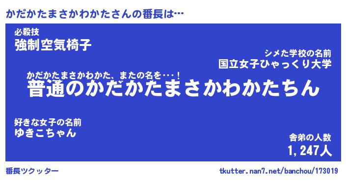 | 男性向けラノベタイトル風あだ名 | 『かだかたまさかわかたの憂鬱』 |