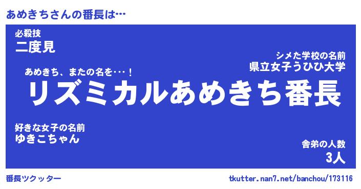 | 肩書あだ名 | 『あめきち御曹司』『あめきち国家主席』 |