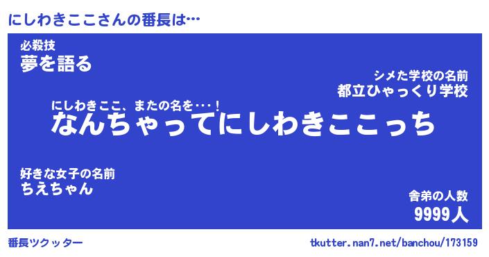 | ヒーロー風カッコイイあだ名 | 『スーパーニシワキココ』『天弓騎士ニシ』 |