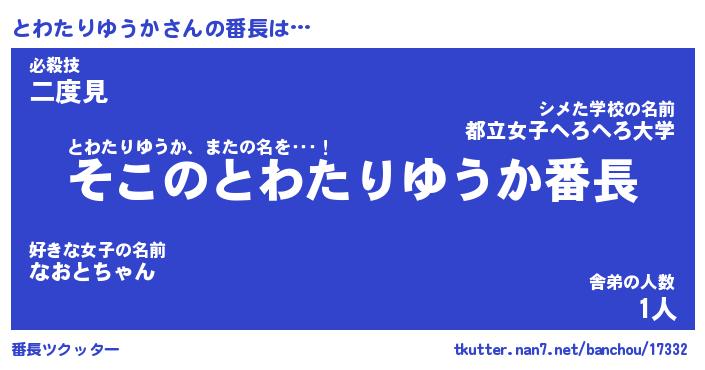 | ヘコむあだ名 | 『とわにゅー』『酢こんぶ』 |
