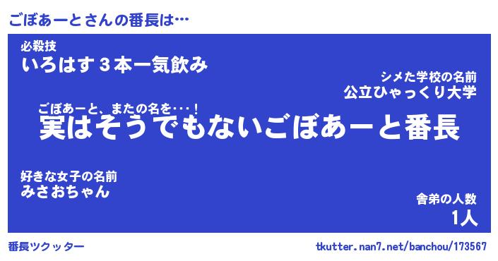 | ヒーロー風カッコイイあだ名 | 『スーパーゴボアート』『銀牙騎士ゴボ』 |