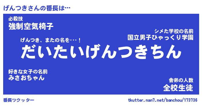 | 男性向けラノベタイトル風あだ名 | 『げんつきの憂鬱』 |