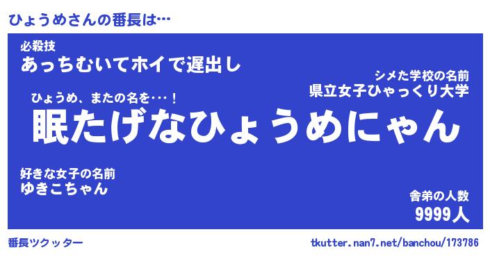 | 意味不明あだ名 | 『ペロリンひょうめ』『永久保存ひょうめ』 |