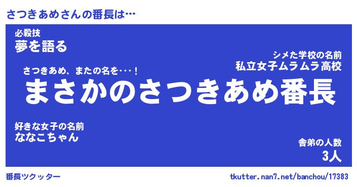 | 肩書あだ名 | 『さつきあめ店長』『さつきあめ総理大臣』 |