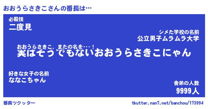 | 伝説のあだ名 | 『封印されしスナイパーおおうらさきこ』 |