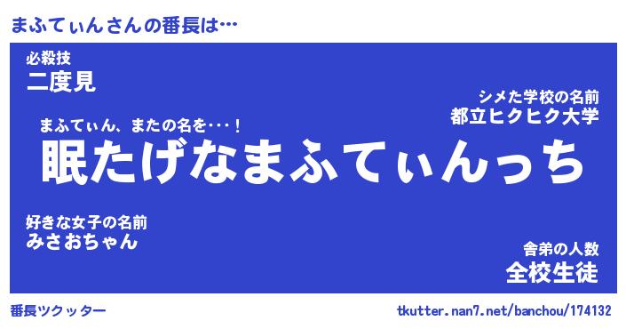 | ファンタジー風あだ名 | 『マフフェル』『エターナルマフティンー』 |