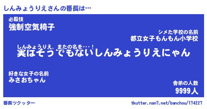 | 伝説のあだ名 | 『封印されしスナイパーしんみょうりえ』 |