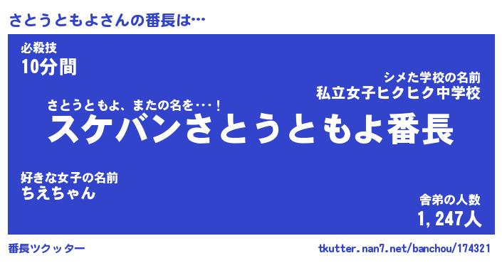 | ヒーロー風カッコイイあだ名 | 『スーパーサトウトモヨ』『銀牙騎士サト』 |