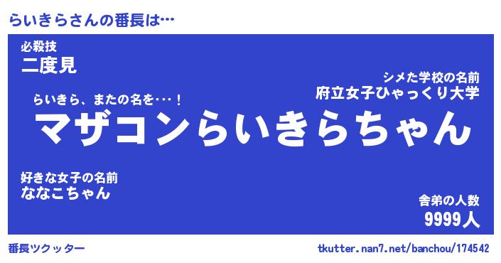 | 肩書あだ名 | 『らいきら店長』『らいきら総理大臣』 |