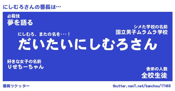 | ポケモン風あだ名 | 『ニシチュウ』『ニシムダネ』 |