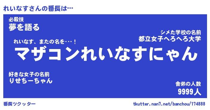 | 意味不明あだ名 | 『ペロリンれいなす』『永久保存れいなす』 |