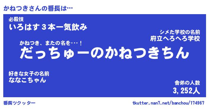 | 肩書あだ名 | 『かねつき店長』『かねつき総理大臣』 |