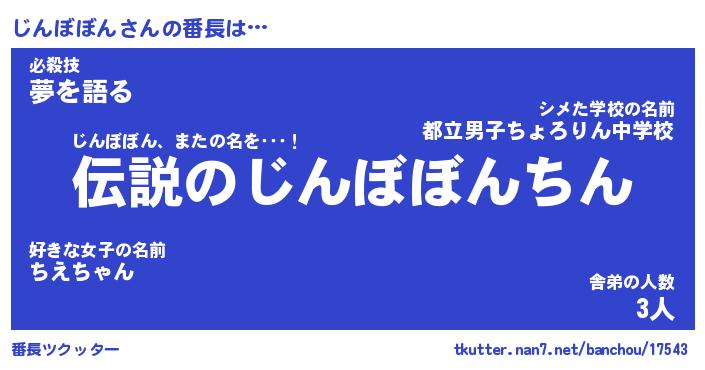 | 男性向けラノベタイトル風あだ名 | 『じんぼぼんの憂鬱』 |