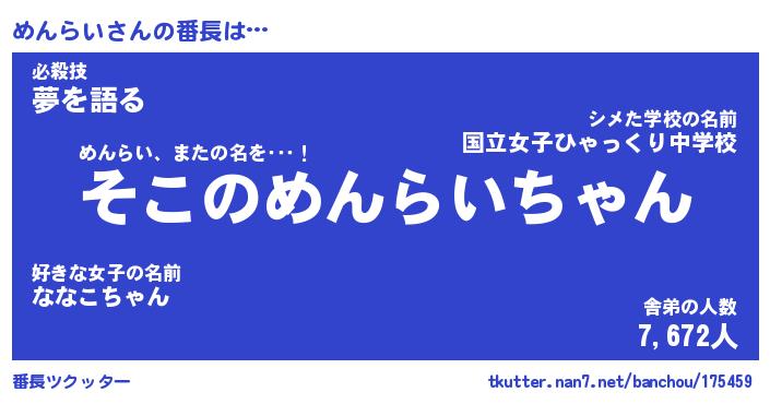 | 意味不明あだ名 | 『ペロリンめんらい』『永久保存めんらい』 |