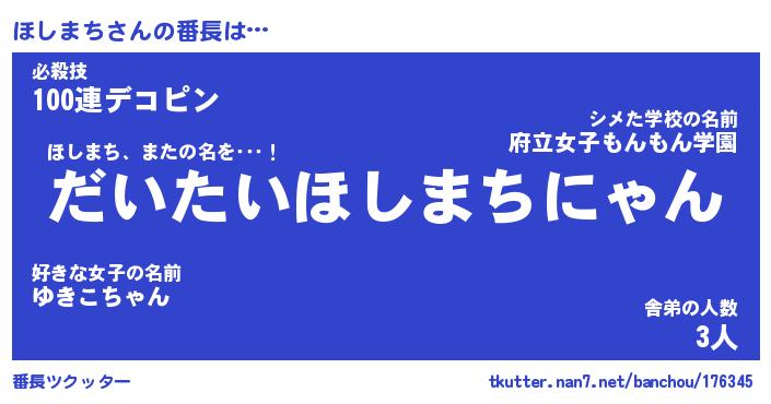 | 意味不明あだ名 | 『ペロリンほしまち』『永久保存ほしまち』 |
