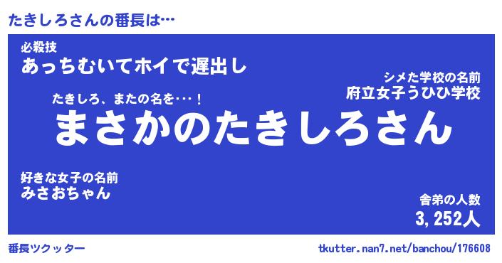 | 意味不明あだ名 | 『ペロリンたきしろ』『永久保存たきしろ』 |