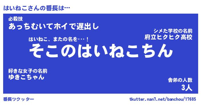 | 意味不明あだ名 | 『ペロリンはいねこ』『永久保存はいねこ』 |