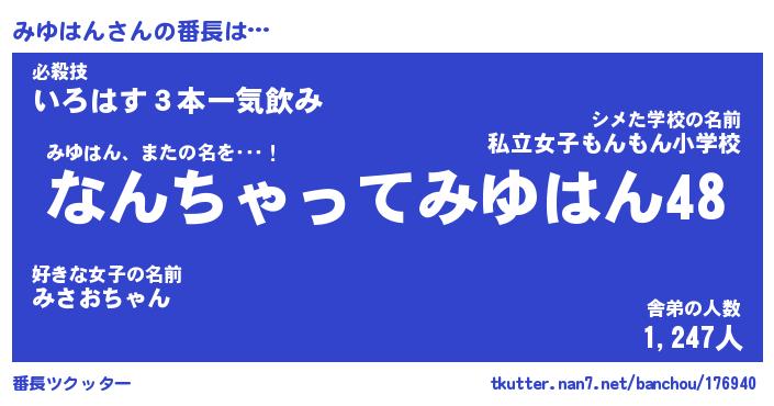 | 意味不明あだ名 | 『ペロリンみゆはん』『永久保存みゆはん』 |