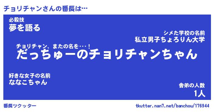 | 男性向けラノベタイトル風あだ名 | 『チョリチャンの憂鬱』 |