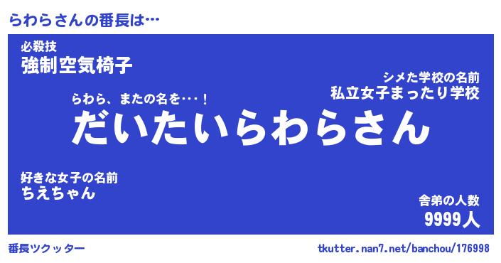 | 肩書あだ名 | 『らわら社長』『らわら総理大臣』 |