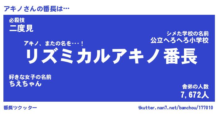 | ヒーロー風カッコイイあだ名 | 『スーパーアキノ』『ウルトラアキノマン』 |