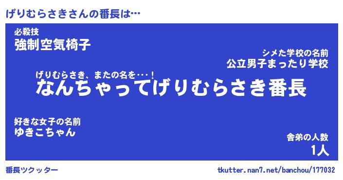 | ヒーロー風カッコイイあだ名 | 『スーパーゲリムラサキ』『暗黒騎士ゲリ』 |