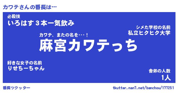 | 意味不明あだ名 | 『ペロリンカワテ』『カワテフォーエバー』 |