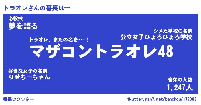 | 意味不明あだ名 | 『ペロリントラオレ』『永久保存トラオレ』 |