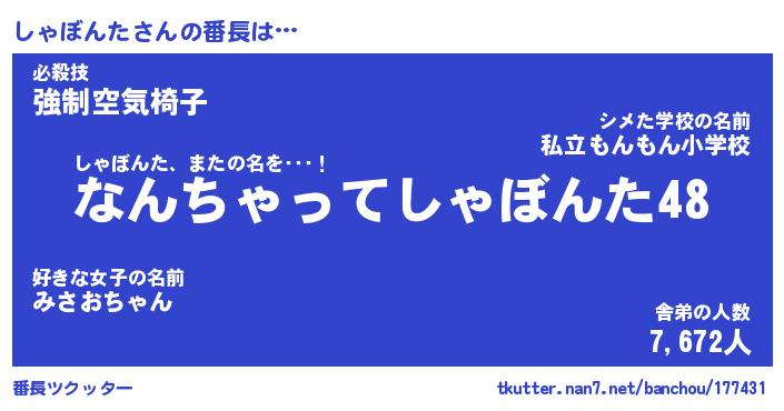 | 伝説のあだ名 | 『伝説のスナイパーしゃぼんた』 |