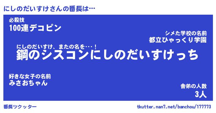 | 恥ずかしいあだ名 | 『プリティーにしのだいすけ』『にしちん』 |