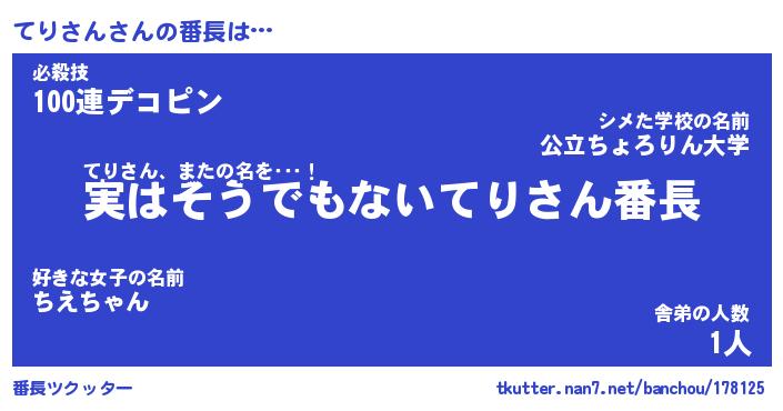 | 肩書あだ名 | 『てりさん店長』『てりさん総理大臣』 |