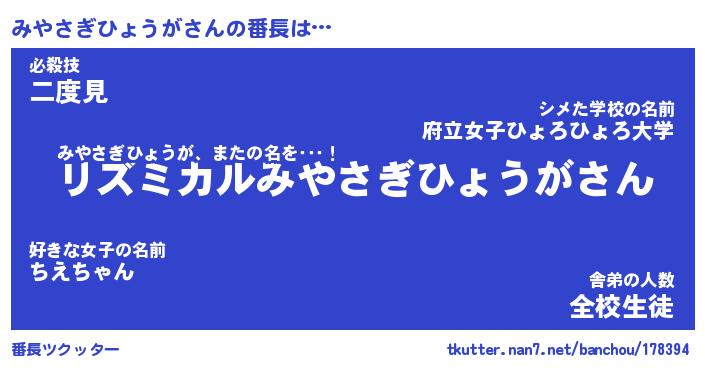 | 男性向けラノベタイトル風あだ名 | 『みやさぎひょうがの憂鬱』 |