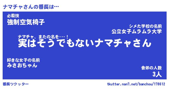 | 意味不明あだ名 | 『ペロリンナマチャ』『永久保存ナマチャ』 |