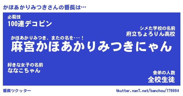 | 伝説のあだ名 | 『不死鳥のスナイパーかほあかりみつき』 |