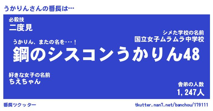| ヒーロー風カッコイイあだ名 | 『スーパーウカリン』『炎刃騎士ウカ』 |