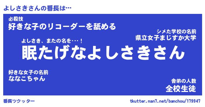 | 意味不明あだ名 | 『ペロリンよしさき』『永久保存よしさき』 |