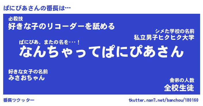 | 意味不明あだ名 | 『ペロリンぱにぴあ』『永久保存ぱにぴあ』 |