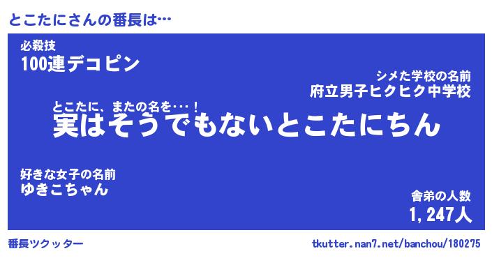 | ヘコむあだ名 | 『とこにー』『つくし』『とこ太郎』 |