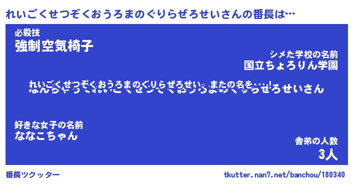 | 欧米人風あだ名 | 『マイケルれいごくせつぞくおうろまのぐりらぜろせい』 |
