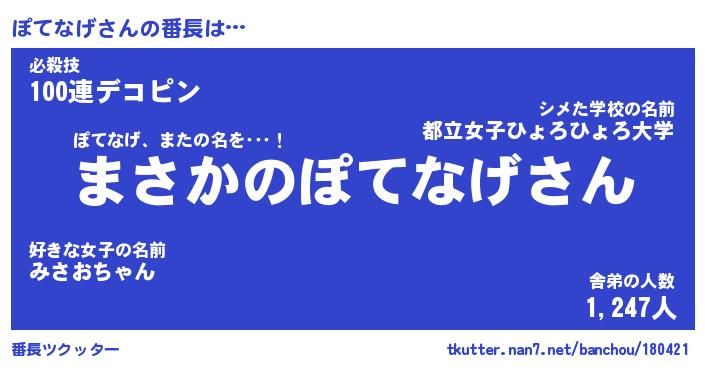 | 意味不明あだ名 | 『ペロリンぽてなげ』『永久保存ぽてなげ』 |