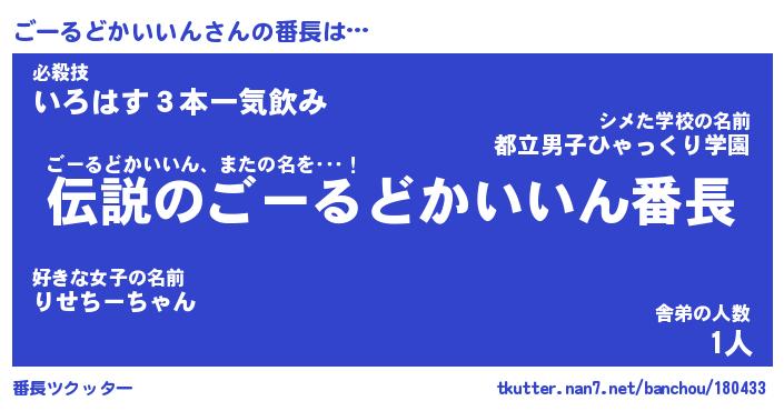 | 伝説のあだ名 | 『伝説のスナイパーごーるどかいいん』 |