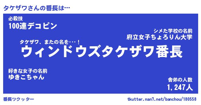 | ファンタジー風あだ名 | 『タケフェル』『エターナルタケザワー』 |